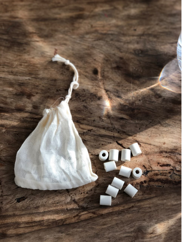 Le lot contient 15 perles de céramique capables de filtrer 1 litre d’eau. Leur durée de vie est d’environ 10 ans. Les perles sont emballées dans un sachet pour le thé en coton bio